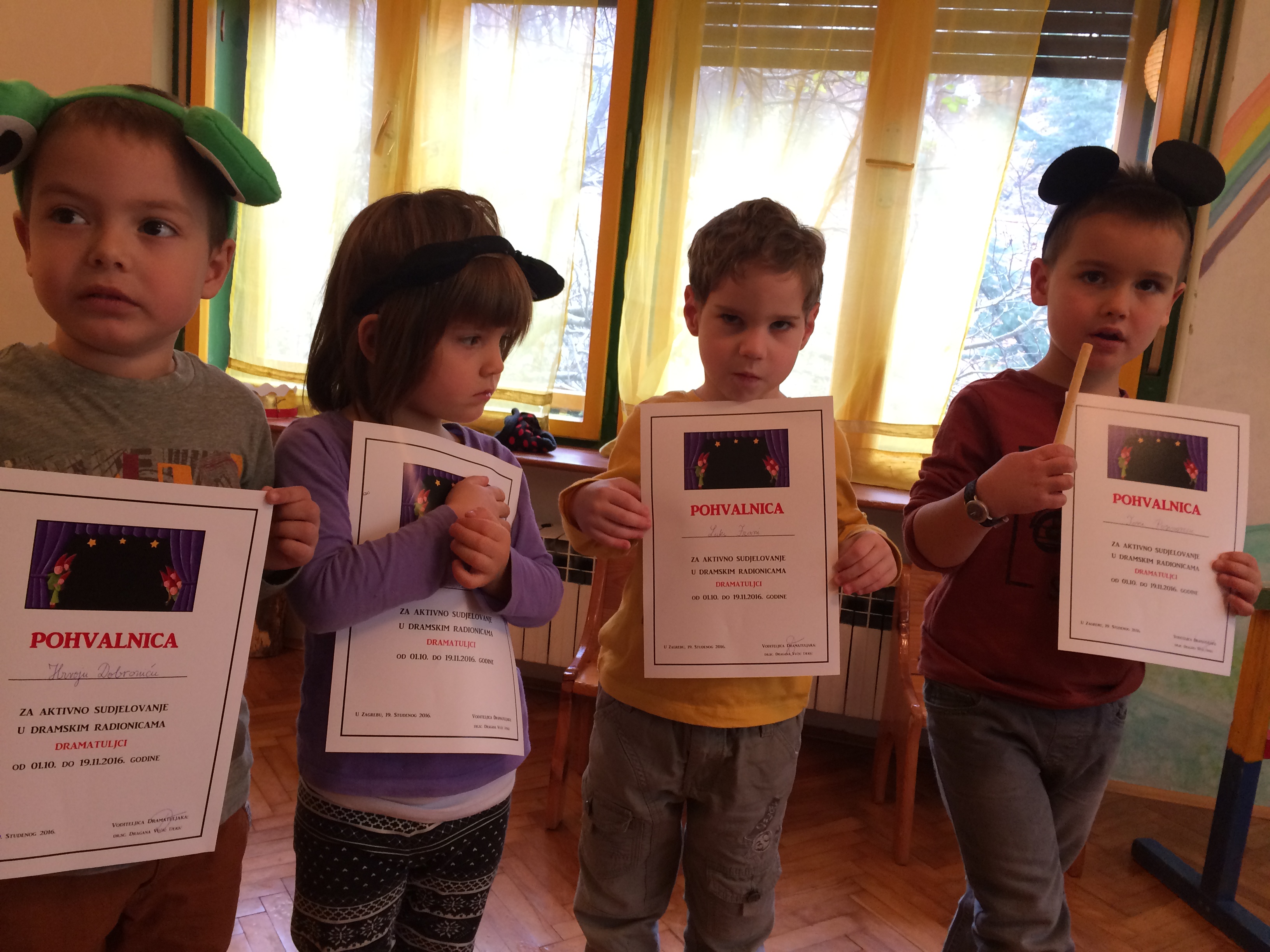 Djeca spontano stvaraju igru, a kako igra može biti stvaralačka pokazali su naši najmlađi Dramatuljci trogodišnjaci i četverogodišnjaci: Lota, Hrvoje, Aura, Pia, Toma, Viktor i Luka koji su aktivno i kreativno sudjelovali u dramskim igrama i glumili u kratkim igrokazima. U sklopu programa Dramatuljaka djeca ne uče samo glumiti jer to ionako znaju od rođenja, već ponajviše uče slušati jedni druge, čekati svoj red i surađivati, izražavati otvoreno svoje misli i osjećaje. Maštom, pokretom, gestom i govorom stvaraju razne likove i situacije, sve s puno radosti, smijeha i razigranosti. Jedan ciklus dramskih igraonica za djecu u dobi od 3 do 4 godine – traje 8 subota, po 45 minuta. Novi ciklus počinje od 14. siječnja 2017. godine. Pridružite nam se!